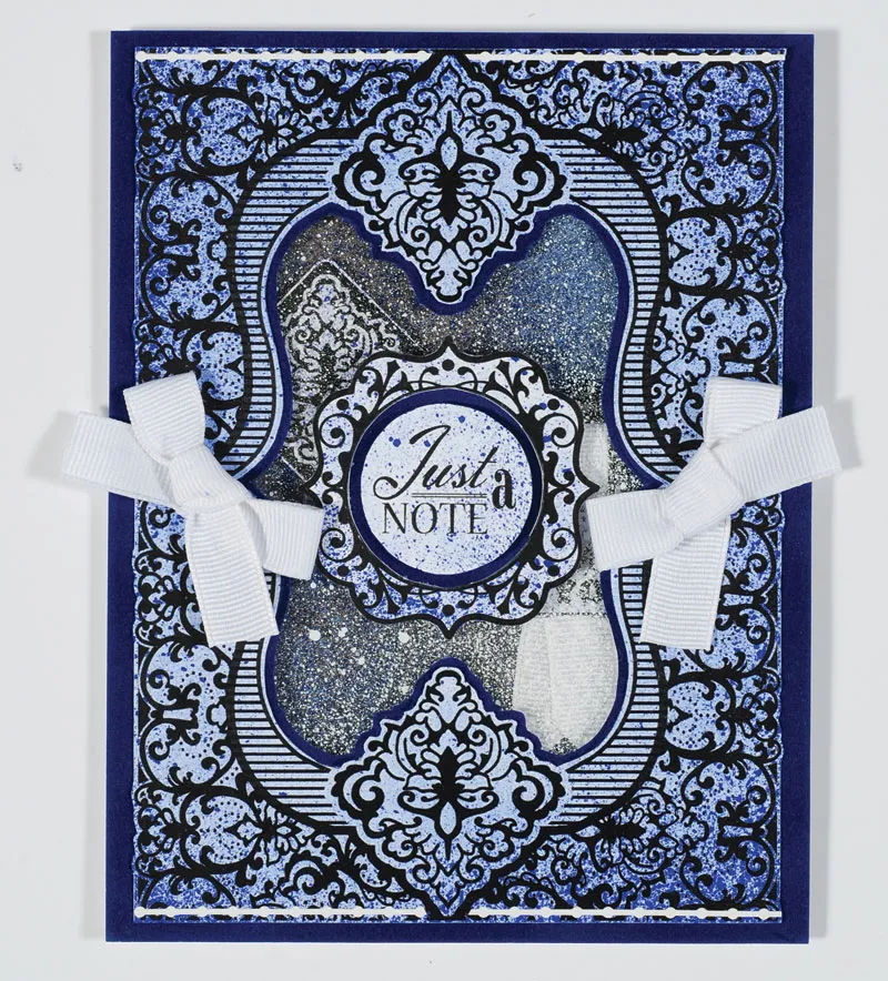 Mist a 5”x6 1/2” acetate with White Linen ink spray, allowing the mist to fall on the acetate in spatters, but not too heavily. Zot™ the acetate to the back of the card cover. Cut out the “Just a Note” label, mist blue and foam tape over the acetate. Zot™ white grosgrain bows on each side of the frame.