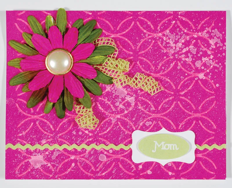 Mist a large paper flower with Dirty Martini (green) and a medium with Fuchsia. Let dry, then Zot to the top left corner. Zot a gold/pearl button to the flower center. Cut three 3”-4” long green lattice ribbons. The ends will naturally coil on their own. Glue under right side of flower. Glue a length of green rick rack across the card, 3/4” from the bottom. Punch the label from white cardstock and the oval from lime green. Foam tape to the right side of the rick rack. Personalize with a white Dazzles™.