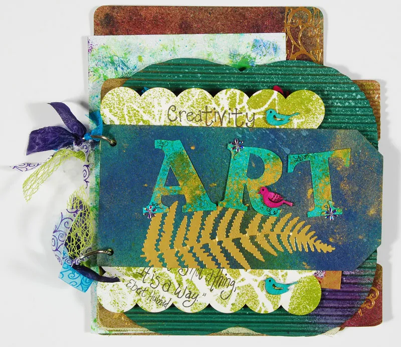Monograms Tip: To get double duty from your letters, before misting them, place them on the canvas page and then mist and you will have a repeated word. Mist with Calypso Teal and add Gold Perfect Pearls™ while ink is still wet. Let dry. Glue to the cover, over the fern. Use the black pen to embellish letters with loopy lines on opposite corners. Add Purple Jewel Flowers Dazzles™. Mist a wooden bird with Fuchsia and Zotä to the album once dry.