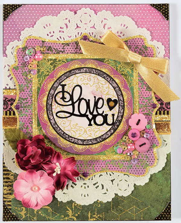 TECHNIQUE: JOURNALED AND STACKED DIE-CUTS Left page: If using the computer, print your journaling (names, in this case) onto printer paper, temporarily glue the long banner die-cut over the printing and run through again. Remove the die-cut from the paper, ink the edges white, let dry, then foam tape in place below the photos. Ink the edges of a small oval die-cut and foam tape in place. Right page: Journal onto the die-cut shown, then ink the edges of the die-cuts used, let dry, then stack with foam tape, as shown. Font: Savoye, 24 pt.