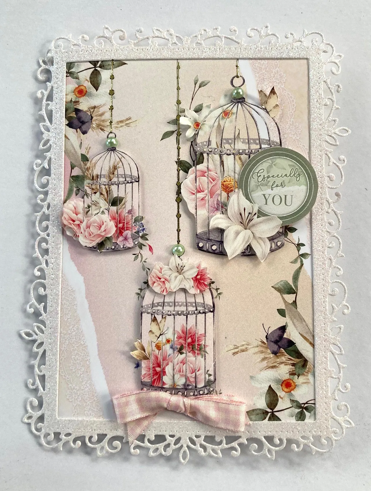 Cut a card to 4 1/4"x6" with the fold on the left. Select the cages page from The Little Book of Everlasting Blooms and glue to the front. Die cut the large frame from the Elegant Frames Die set out of the white glitter cardstock. Glue along the outside edge of the card front so the frame is free over the edges. Use multiple identical pages to create layers on the image. Cut out the "Especially for You" sentiment from The Little Book and foam tape as shown. Cover the bird cage chains with border Dazzles™️. Zot™️ a 2" pink bow at the bottom as shown. Add pearl Diamond Sparkles as shown.