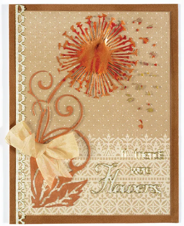 Place Red Variegated Metal Leaf onto the dandelion head and seeds and pat onto the glue with your fingers. Place Copper Metal Leaf on the stem, swirls and leaves and pat in place. Place scrap acetate over the embossed image and rub over the image with a bone folder, burnishing the Metal Leaf in place. Remove the scrap acetate and use the stipple brush to remove the excess Metal Leaf by brushing all over the image, using a circular motion. Continue brushing until the edges of the image become clear and distinct. The excess Metal Leaf can be saved in a container for another use. Zot™ the acetate over the lace paper on the front of your card.