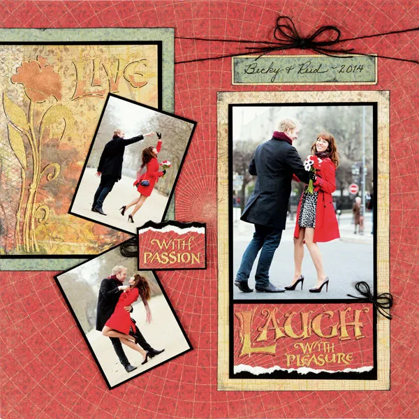 Mat two 2½”x3½” photos on Black Suede with 1/16" borders and glue at an angle on the “LIVE” piece, as shown. Tear the top edge from the “WITH PASSION” piece and mat on Black Suede with 1/16” border, tearing the top. Foam tape over a double loop of twine between the two small photos.