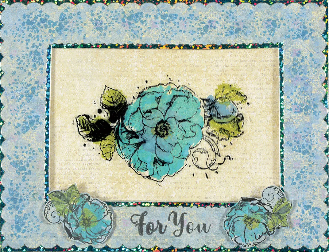 Card inside: Glue 6 3/8”x4 7/8” Winters Butterfly ivory script paper centered. Close the card, and make light marks at each corner of the frame. Open the card, and stamp the image, in Memento ink, centered within the marks. Use the orange circle solid stamp with Broken China ink to stamp the flower. Use the blue circle solid stamp with Faded Jeans ink to stamp the middle of the flower. Use the blue, gray, lavender circles stamp with Fossilized Amber ink to stamp the center of the flower. Stamp the rosebud with the teal solid stamp, and Faded Jeans ink. Stamp the leaves with the same stamp, and Peeled Paint ink.