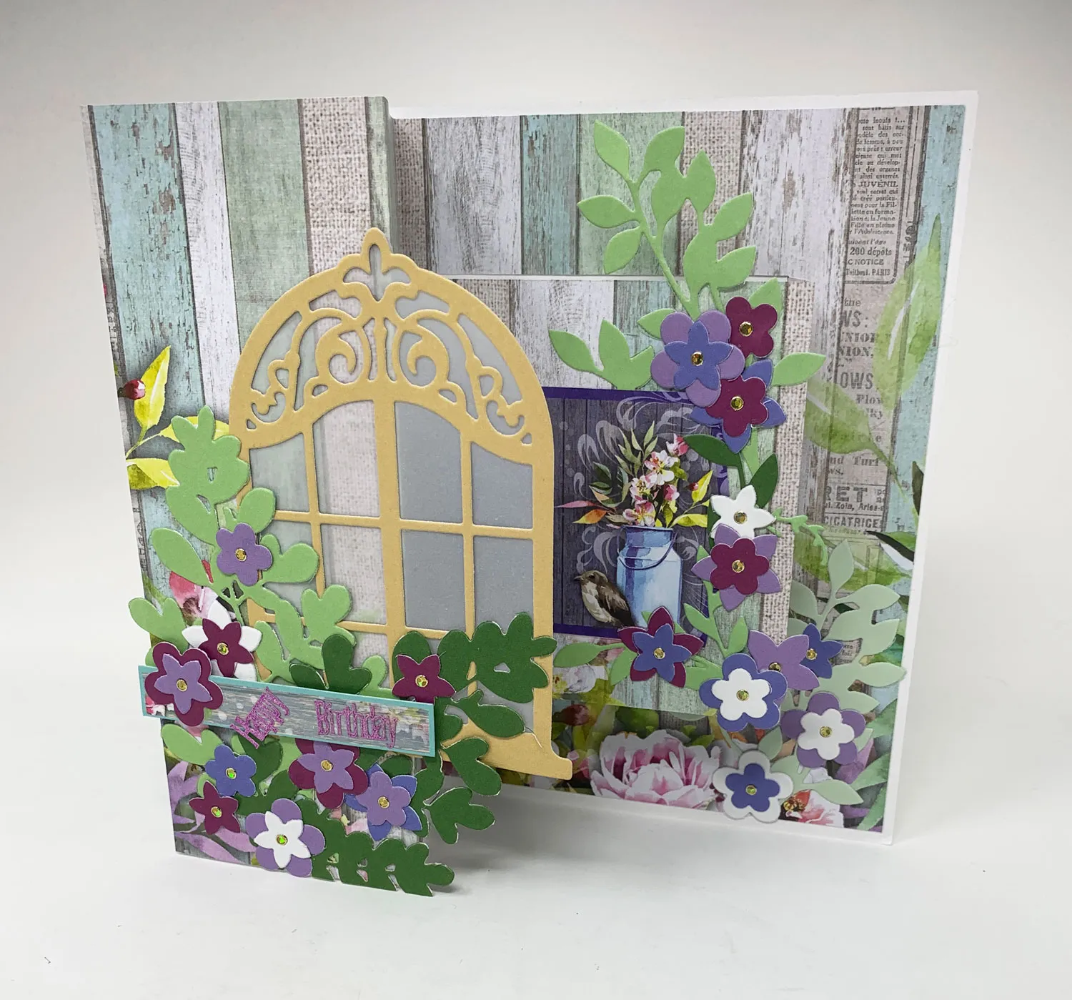 3. Die cut leaf branches and sprigs from the green cardstocks and the flowers from magenta, white, lavender, and blue cardstocks. Glue two large leaf sprigs to the lower front as shown, trimming off the excess along the card bottom. Glue large and small flowers to the front as shown.