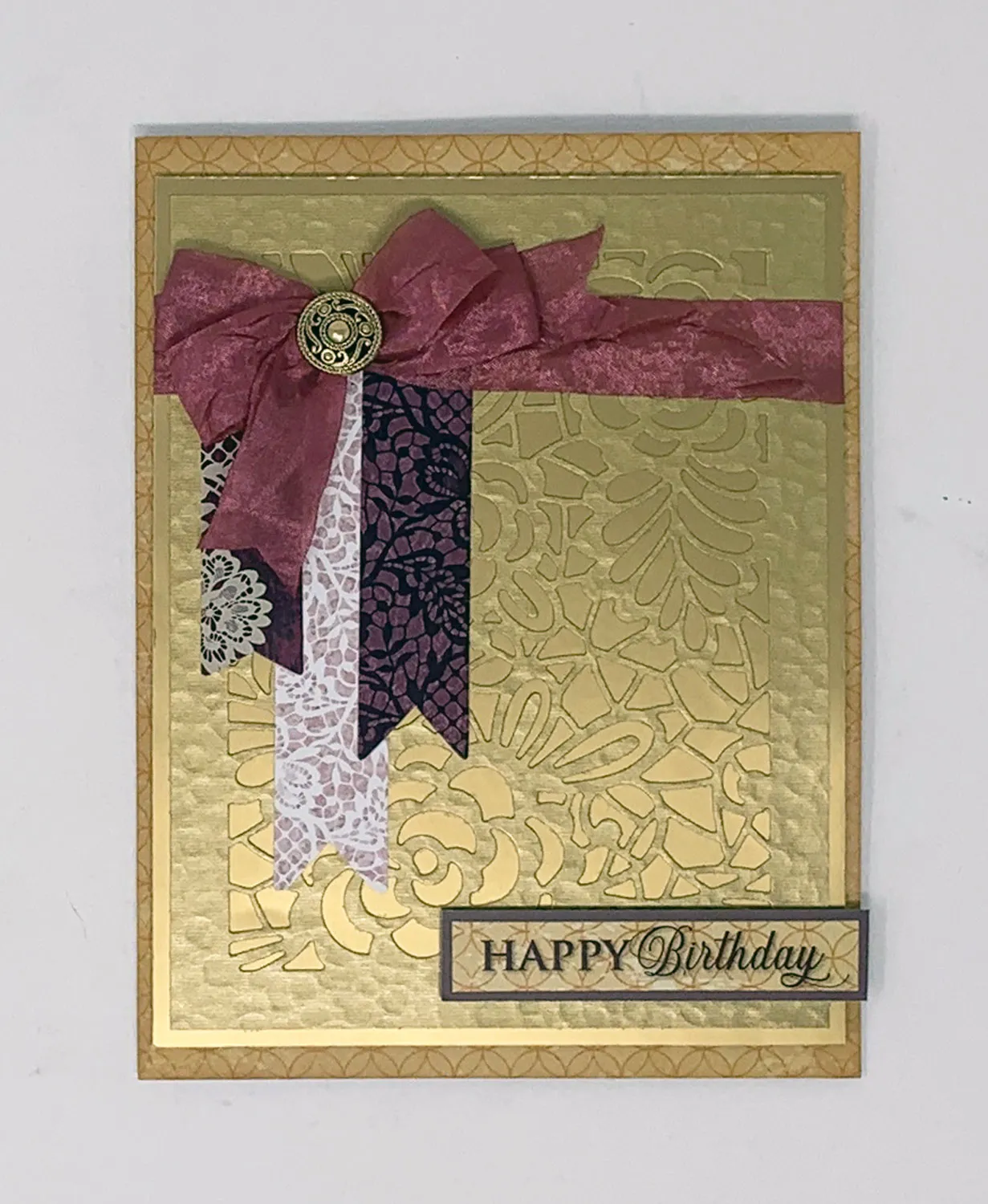 Cut 4½"x5¾" Hammered Gold paper and center the inside rose lace die on it. Die cut the paper, then use Sticky Specks to mat it on Metallic Gold paper with 1/8" borders. Wrap a 6½" length of mauve crepe ribbon across the panel, 1" from the top, and glue the ends to the back. Foam tape the panel to the card’s center front.