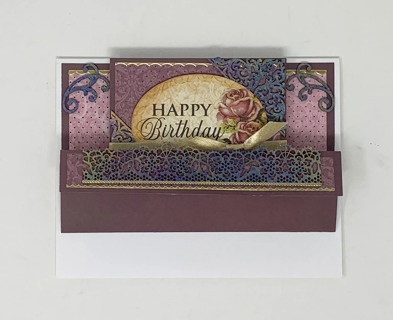 Place a gold thin line Dazzles™ along the lower edge of the lace chipboard. Glue the chipboard shapes to the front as shown. Cut out the Chantilly Lace “happy birthday” label and blend ink along the edges. Foam tape it to the front as shown.