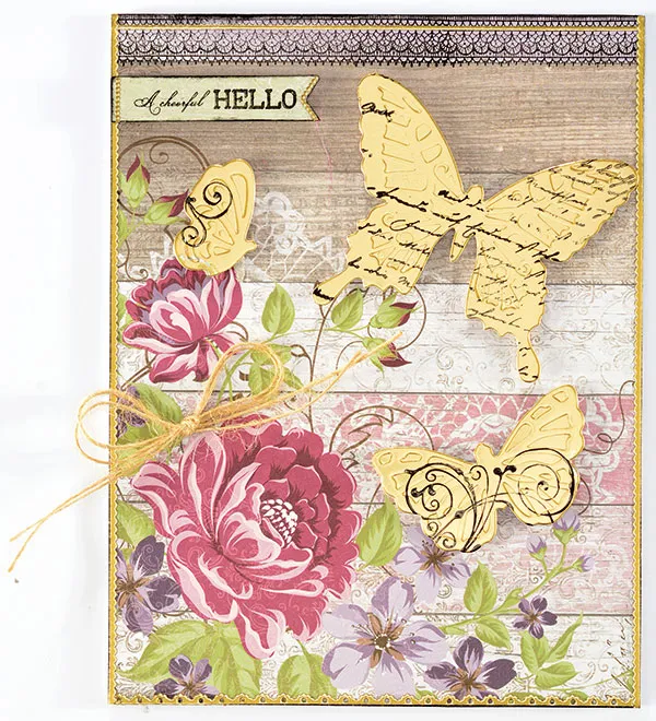 Stamp 2 Butterflies Foiled Fancies with the large swirl stamp and 1 with the script stamp. Foam tape the butterflies on the card near the flowers as shown. Stamp “A cheerful HELLO” on remaining light green paper (from the floral corner sheet) with black ink. Cut around the words to create a 2”x3/8” rectangle. Cut a notch in the right end and ink the edges. Add Gold Thin Lines Dazzles™ on each end as shown. Foam tape on the upper left portion of the card. Place two 10” lengths of natural jute twine together as 1 and tie a bow. Zot™ the bow on the left side of the card as shown.
