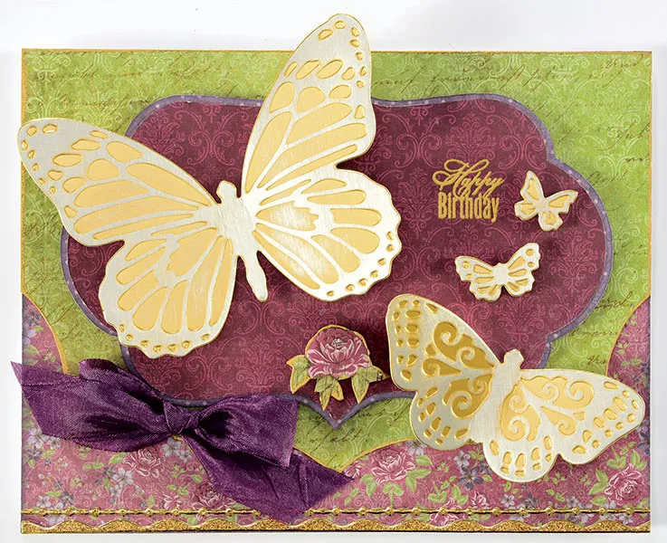 Sand across the embossed surface of the Butterflies Foiled Fancies that you will be using with the sanding block until silver appears. Gently fold the wings of the larger butterflies together for a 3-dimensional look. Foam tape the bodies on the card as shown. Foam tape small butterflies near the words. Cut out a flower from remaining floral paper and emboss the edges gold. Foam tape on the label as shown. Add Gold Jewel Dazzles™ across the bottom of the card. Use 3/4" wide purple crepe ribbon to tie a bow. Zot™ the bow on the edge of the burgundy label as shown.