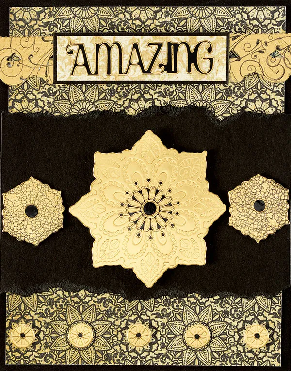 Stamp on a 5” long Foiled Fancies border. Glue 5/8” from the top. Place the Dazzles™ on a 2 7/8”x3/4” Bohemian Dreams tan/cream floral paper, and mat on black cardstock with 1/16” borders. Foam tape centered on the border.