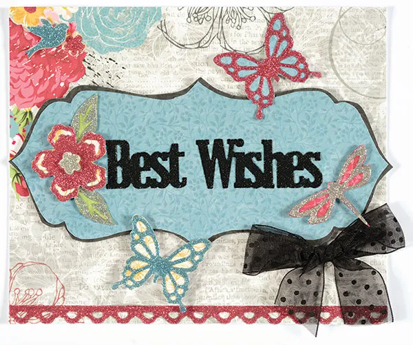 Back the Double-Stick butterfly, flower, dragonfly and small bird Dazzles™ with Sunday Musings papers. Cover the top with various colors of Silk Glitter. Cut close to the Dazzles™ edge. Foam tape around the label.