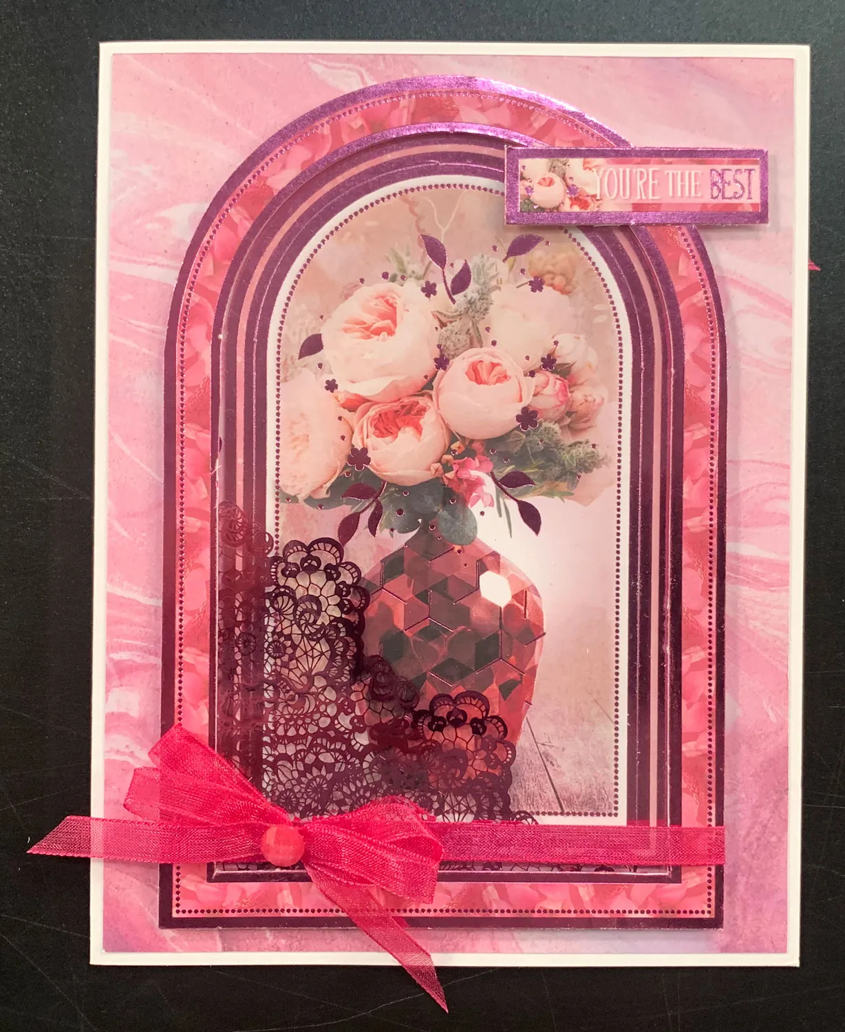 Wrap a 4½" length of ¼" wide magenta sheer ribbon across the frame, ½" from the bottom, and glue the ends to the frame back. Foam tape the frame to the card front, positioning it over the topper.
