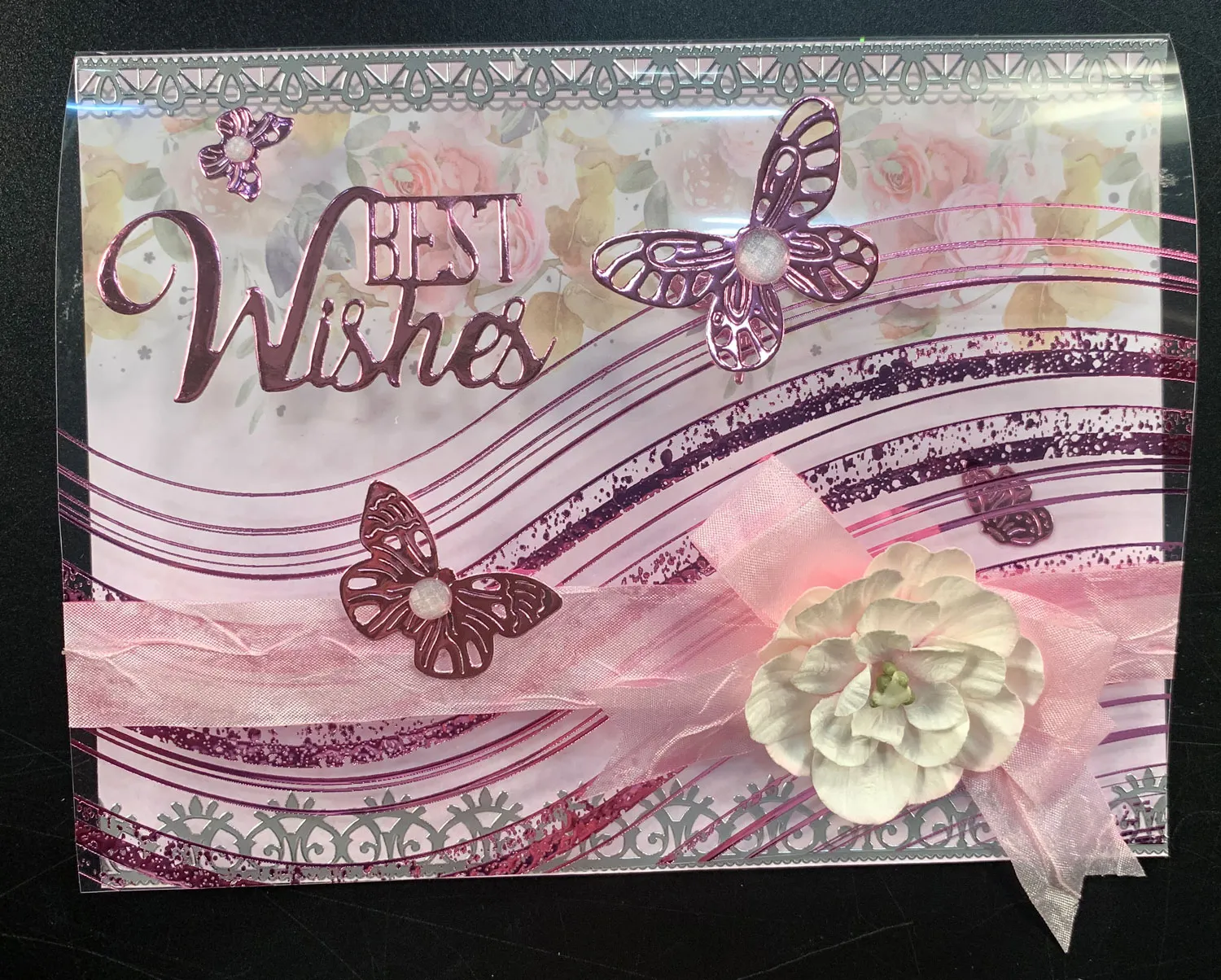 Die cut “best wishes” and the three butterflies shown from mirri card, then glue them to the acetate front as shown. Place a Diamond Sparkle on each butterfly’s body. Use 2-sided tape to attach the white 1½" flower over the bow center.