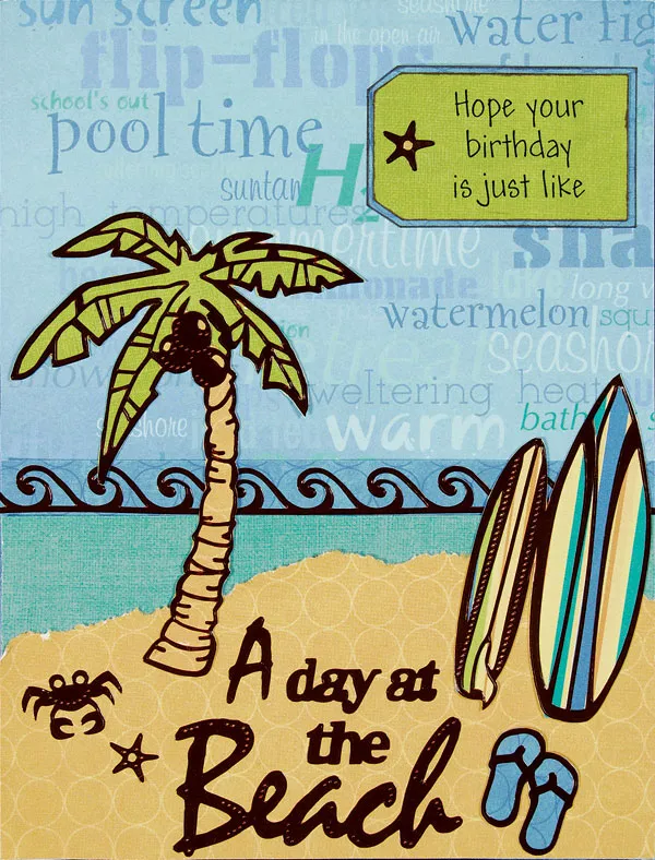 Place the palm tree overlapping the torn tan paper on the left side of the card front and the surfboards on the right. Check for placement of "A day at the Beach" between them, then attach the Dazzles™ in place. Add words, flip flops, tiny starfish, and crab Dazzles™ as shown.