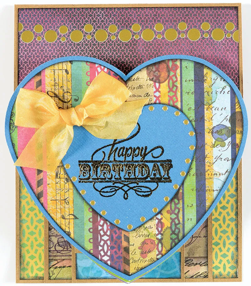 Large heart: Cut the large heart from vertical striped paper. Trace the small heart in the center of the large and cut out. Ink the inner and outer edges of the heart frame. Glue to blue cardstock from the Princess cardstock and cut out with a 1/16" border. Swipe over the middle of the heart with the Perfect Printing Pouch (or embossing pouch). Stamp "Happy Birthday" in the center with Versamark and emboss with Black Super Fine Embossing Powder. Place small Brass Jewel Dazzles around the perimeter of the inner blue heart, each about 1/4" apart, as shown. Tie a small bow from yellow crepe ribbon and glue to the top left of the greeting with a medium Zot.