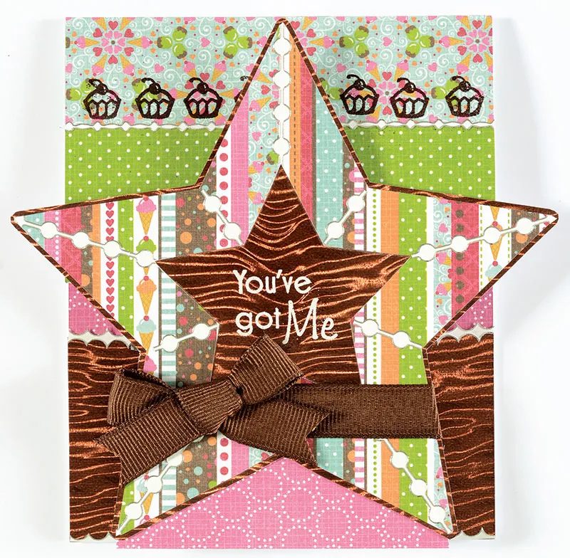 Large star: Trace both the large star and small star inside of it on the back of multi-stripe paper and cut out both stars (cut out the inner star with a craft knife.) Turn the piece over and you should have a star-shaped frame. Glue this to Mocha Ripple Paper and cut around, leaving a 1/16" border. Stamp and emboss "You've got me" in white in the center of the star. (Try to be quick with the heat gun so as not to warp the ripple paper). Decorate the striped star frame with pieces of white Jewel Border Dazzles, trimming to the edges of the star. Cut 4 1/4" of brown grosgrain ribbon and use Zips to glue along the bottom of the large star below the greeting. Attach the ends to the back with Zips or tape. Tie a small bow with the same ribbon and cut the ends in a V. Glue to the left side of the ribbon strip as shown, using Zips.