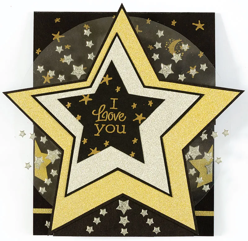 Large star: Cut the large star from gold pearl adhesive material. Peel off the backing and place the star on black cardstock. Cut around, leaving a 1/16" border. Cut a medium star from silver pearl material. Peel off backing and place on black cardstock. Cut around, leaving a 1/16" border. Glue the medium star to the large star, towards the upper left as shown. Trace a small star shape onto black cardstock. Swipe with the pouch. With Versamark ink, stamp "I Love You" in the center and stars all around the shape (some going beyond the pencil lines). Emboss with gold embossing powder, then cut out the star. Erase any pencil lines. Glue the black small star to the medium star, toward the upper left, as shown. Take the Easy Circles Template and place it over the heat resistant acetate. Use a fine-tip permanent pen to trace a 5" circle onto the acetate. Cut out the circle, avoiding the black lines (cut just inside the line). Position the circle centered over the large star. Use the permanent pen on the acetate to sketch a line about 1/4" inside the outer edge of the star. Remove the acetate circle and cut along your traced line. Cut off one of the 5 sections (the bottom section of the star doesn't need acetate.) Place about 1" long pieces of Zips along all of the straight edges of the acetate shape (where it will be attach to the back of the cardstock star. Place the acetate with the sticky Zips side up. Take the large star and carefully center it over the acetate circle (with the empty section on the bottom). Press down, adhering the acetate to the back of the star. Place a large silver star Dazzle on the acetate in each of the inner angles of the card, followed by medium star, then small star Dazzles. You now have 4 rays of stars. (the 5th will be added once the card is assembled). Add a 3-small star ray to the right and left of each of the existing rays, so you end up with 3 rays between each of the large spokes of the cardstock star.