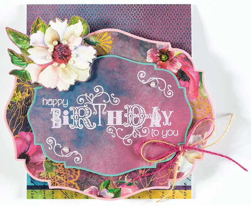 Large label: Cut the label from purple floral paper and mat on pink cardstock from the Princess Cardstock, leaving a 1/16" border. Cut a medium label from pink/purple watercolor. Swipe over it with the Perfect Printing Pouch. Using VersaMark™ ink, stamp a swirl in the upper right and lower left. Stamp the greeting in the center. Emboss with lavender embossing powder. Mat onto teal cardstock with a 1/16" border. Foam tape to the center of the large label. Cut around one of the white flowers on the purple floral paper. Mount it on purple cardstock and trim around (leave no border). Foam tape the flower to the upper left of the large label, overlapping the medium label (you'll need 2 layers of foam tape toward the outer edges). Apply 3mm adhesive pearls around the center of the white flower and 1 on each swirl as shown. Tie a bow with the tan and fuchsia twine and glue to the bottom right of the medium label with Zots.
