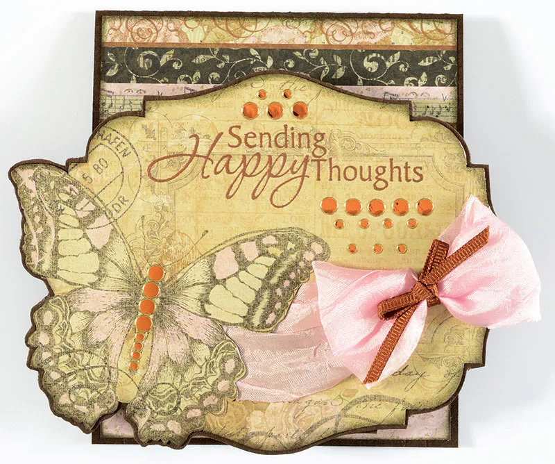 Large label: Place the template on butterfly border paper with the large butterfly going off the bottom left edge of the large label shape on the template. Trace the label shape with a pencil. Remove the template. Cut around the label shape except when you get to the butterfly, cut around the edges of the butterfly and finish cutting the label shape. Erase all pencil lines. Ink the edges of the piece brown. Swipe over the piece with the Perfect Printing Pouch. Stamp and emboss "Sending Happy Thoughts" in the top center of the label, with copper embossing powder. With a craft knife, carefully cut around the right edge of the butterfly, making about a 1 3/4" long slit. Tie a small bow with the wide pink crepe ribbon, leaving the ends long. Lift up the slit on the butterfly and thread the left end of the bow through, taping it to the back. Wrap the right end around the label and tape to the back. Take brown narrow grosgrain ribbon and tie it in a small bow around the center knot of the pink bow. Use Zots to secure the ribbons in place. Place Copper Jewel dazzles above and below the greeting and along the butterfly body, as shown. Mat the entire piece on brown cardstock, leaving a 1/16" border.