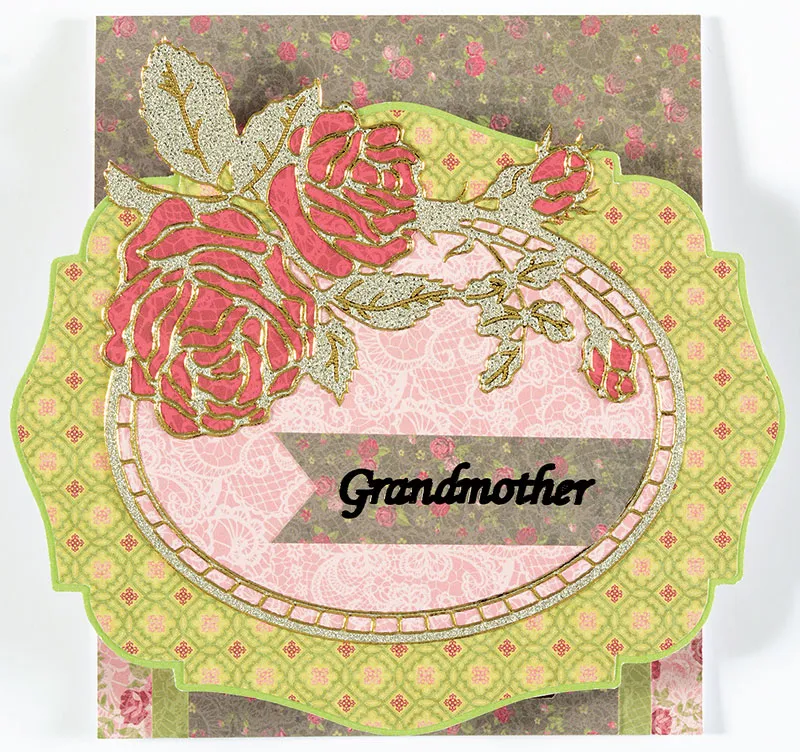 Large label: Cut the large label from yellow tile pattern. Mat on light green cardstock from the Princess Cardstock. Peel off the large oval frame Dazzle from the Roses & Lace Scrapbooking Dazzles. Place sticky side up on the back of red lace paper. Trace the roses through the openings in the Dazzles. Cut out just outside the pencil lines and place the pieces in place on the back of the Dazzle (when you look at the front, the roses should be filled in with red. Place a bit of glue stick on the back of the roses and glue the oval to pink lace paper and cut out. Glue the oval piece to the center of the large label. Cut 2 1/2" x 3/4" of brown floral and cut a V in the left end. Place the piece in the lower right of the oval and sketch the oval's curve on the right end of the piece. Cut out along the sketched line and glue the piece to the oval as shown. Place "Grandmother" in the center of the brown floral piece.