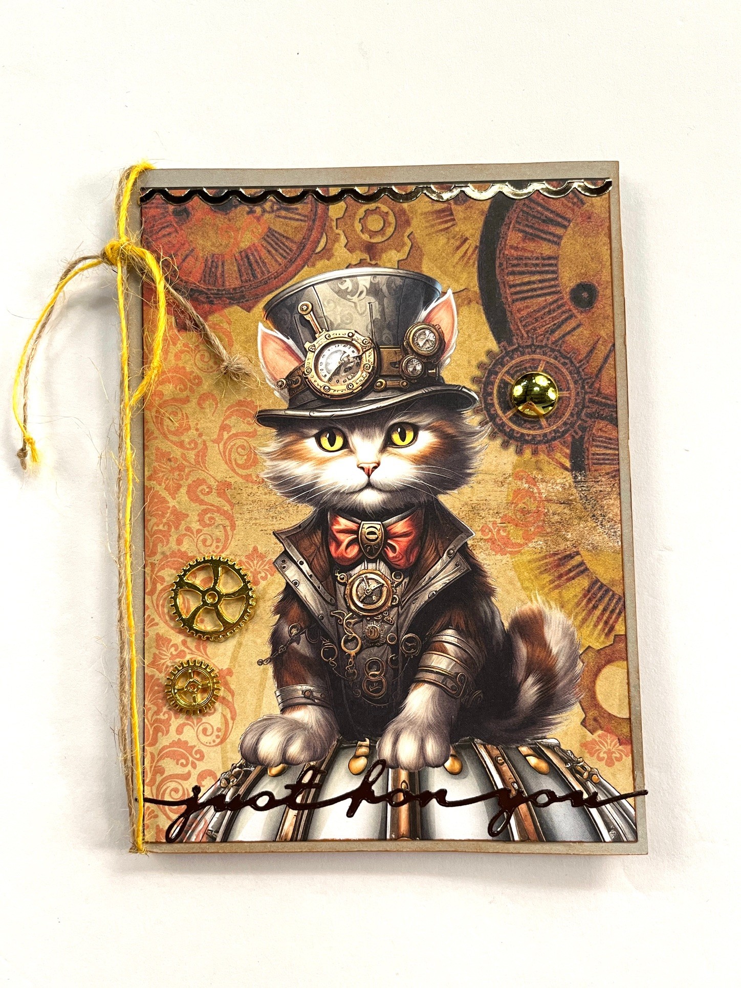 From the gray/tan Steampunk for Everyone Solid Cardstock, cut 8 ½”x5 ¾” piece and 10 ½”x5 ¾” piece. Fold the smaller piece in half making 4 ¼”x5 ¾” card. Lay the larger piece flat and score 2” from the narrow end. Then fold the remainder in half also making 4 ¼”x5 ¾” piece. The 2” piece will become an inside pocket. Color the brown edges with cocoa bean ink pad.