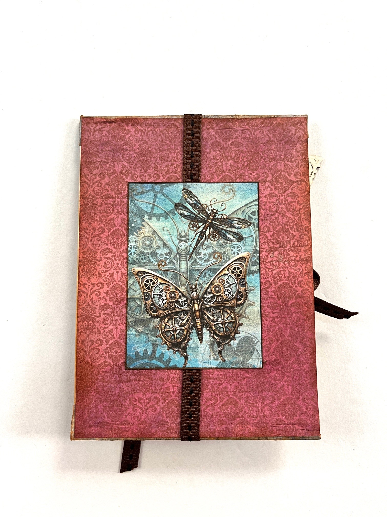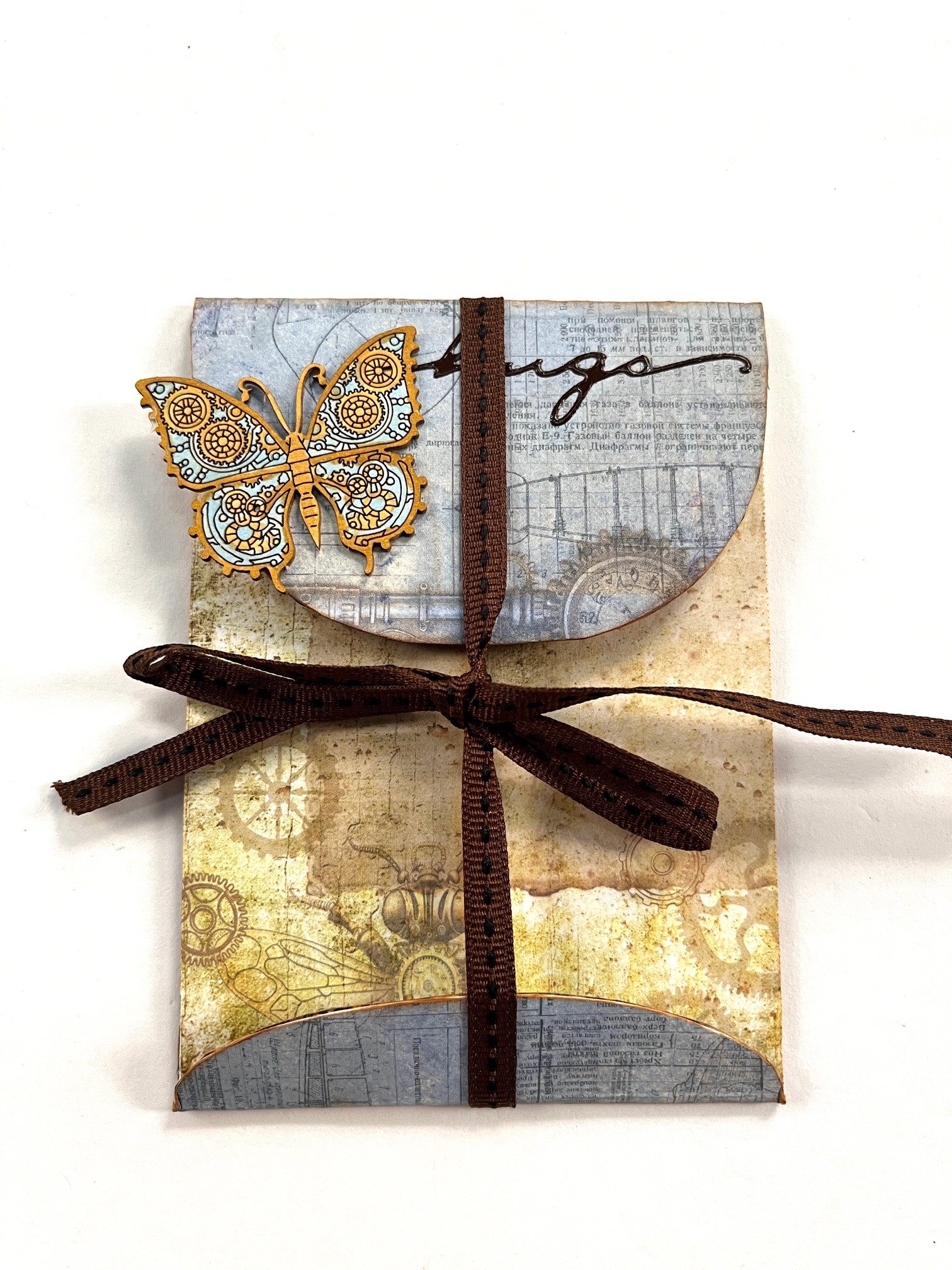 Each of the sections of the Coin Envelope is covered with Steampunk for Everyone 6x6 Patterned Cardstock. Just apply glue to the section of the envelope you want to cover, place the cardstock, press down and trim to fit. Ink all the edges for a finishing touch. Make a pocket with 3 ¼”x1 ¼” gold Patterned and glue three sides inside the Envelope. Tuck in cutouts and add “May your day be the BEST!” cutout on the pocket. Apply cocoa bean ink pad to all the edges. Use true blue and gold brown on three Steampunk for Everyone Chipboard pieces. Glue to the envelope. On the front place “hugs” script Dazzles™ on the top flap. Cut 24” length of brown ribbon and place the center of it on the back of the Envelope. Glue butterfly cutout over it and bring the ribbon ends to the card front and tie a bow. This will fit in the 10 Envelopes for mailing.