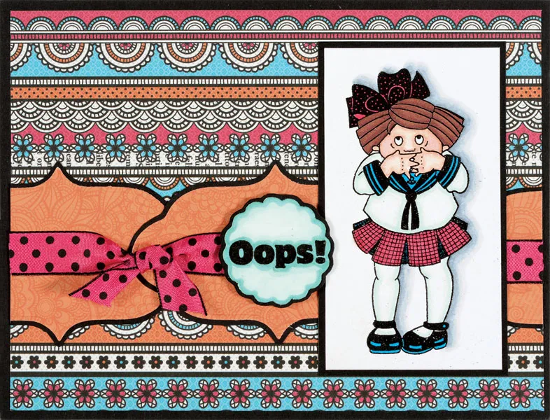 Glue the image to the card ½” from the right and bottom. Cut a round scalloped shape from white cardstock using the dies. Emboss “Oops!” in the middle with Black Embossing Powder (use embossing pouch if desired). Color in with Spectrum Noir pens BT4 & BT2 from the Turquoises Set. Foam tape the circle in the center of the middle orange label shape.