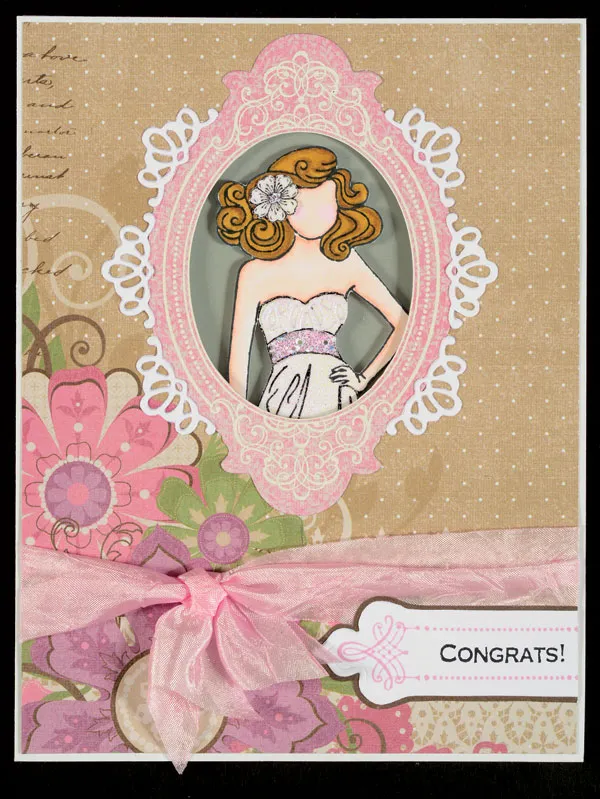 Cut off two green leaves from the vine ribbon in the ribbon set. Cut two 1 ½” inch lengths of ¼” wide sheer lilac ribbon. Glue the ends of the ribbon to the card 3” from the right and bottom. Cut the ends in a “V” shape as desired. Glue the leaves layered on top of the ribbon as shown. Foam tape the bride centered so that her top half shows through the window on the front of the card, and the ribbons are coming out of her hand on the left side. Glue the 3 remaining pink sparkly flowers over where the ribbons are coming out, so that it appears as a bridal bouquet.