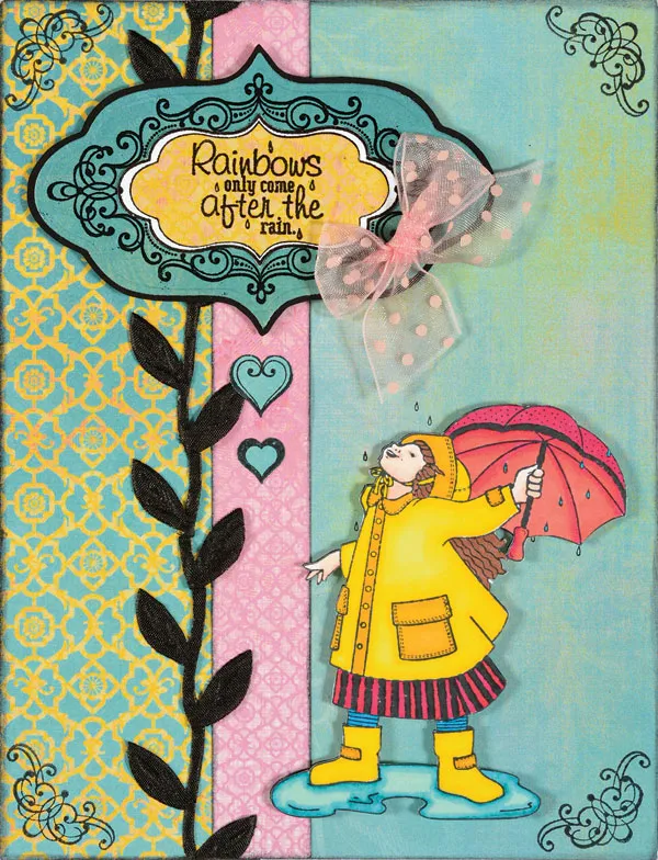 For the girl: Stamp the umbrella girl directly onto the card ¼” from the right and 3/8” from the bottom with Black StazOn®. Stamp the same image on Ultra Smooth white cardstock with Tuxedo Black Memento ink. Color in the image using the following colors. Use the darker color first where possible. Jacket, hat & boots: Yellows, GB5, CT2, CT4. Skin: Pale Hues, FS3 & FS2. Hair: Browns, TN7. Water: Turquoises, BT5 & BT2. Tights: Turquoises, BT7. Dress: Reds, CR11. Umbrella: CR10 & CR11. Cut out the image and foam tape it over the already-stamped image on the card.