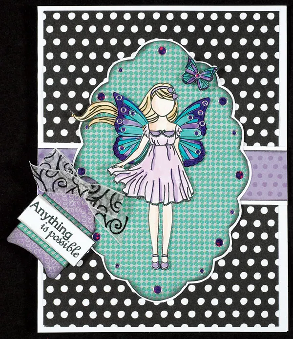 Stamp Paper Dolls “Anything is possible” stamp onto Silky Papers and cut to 1 1/2”x5/8” and ink edges. Trace Design Tool Kit #3 Elegant Tag onto Simply Susan purple paper and glue 3/4” wide strip of aqua houndstooth across the tag center. Ink the tag edges and foam tape the greeting to the border as shown. Glue to the left side of the card as shown. Use 3/8” wide white and black swirl sheer Simply Susan ribbon to make a bow and Zot to the tag.