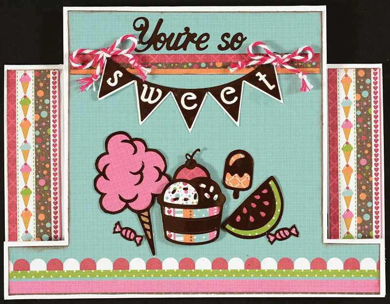 Back Tasty Sweet Dazzles™ ice cream Sunday, cotton candy, watermelon and candy with Sweet Life Papers as shown. Glue and foam tape below the banner. Trace the left and right side panel patterns onto striped paper and ink the edges. Glue to the card side steps.