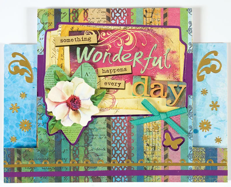 For the front: Assemble your center-step card according to the package instructions. Cover the front panel with vertical striped paper, trimming it to fit. Cover the side panels with blue watercolor. Cut 4 1/2" x 1 1/4" of purple mirror sheet. Peel off backing and apply it to the card 1 1/4" from the top. Punch out the base layer of the paper tole piece and mat it on purple mirror with a 1/16" border. Apply to card centered on the purple strip. Place a small gold butterfly on purple mirror and cut around, leaving a 1/16" border. Apply to card in the lower right as shown. Cut 6 1/2" x 1/8" of purple mirror and apply it to the card 1/4" from the bottom. Place the Dazzles™ border 1/8" above this strip. Place more small Dazzles™ on the front and sides of the card as shown. Attach a small teal grosgrain bow to the lower right of the paper tole as shown.