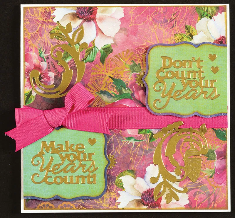 For the front: Place your card with the fold on the top. Trim to a 5" square. Cut a floral piece to a 4 7/8" square. Use a cosmetic sponge and Metallic Gold StazOn® to ink the edges gold. Tie a bow with pink grosgrain. Loosen the knot a bit, and thread a 6" piece through the back of the knot. Adjust the bow so it is toward the left end of the long ribbon. Place Zips™ across the center of the floral paper, about 2 1/4" from the top. Adhere the ribbon and bow to the sticky strip of Zips™. Wrap the ends around and attach to the back with Zips™. Glue the floral piece centered on the front of the card. Cut 2 Design Tool Kit #7 Designer Labels from green watercolor and ink the edges gold. Mat on purple with a 1/16" border. On the first label, cut off 1/2" from the right side and place "Don’t count your years." On the second, cut 1/2" off the left side and place "Make your years count." Add small hearts as shown. Foam tape the first label just overlapping the pink ribbon on the right side. Foam tape the second below the bow on the left as shown. Place large swirl Dazzles™ in the top left and bottom right as shown. Place a flower Dazzles™ behind the pointed end on the top right label and the bottom left label, as shown.