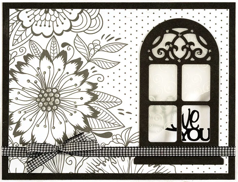 Die-cut a window from black cardstock, set on the right side of your card, trace around the outer edges with a pencil, then remove the die-cut. Open the card and cut out the window, keeping 1/8” inside the traced line. Back the die-cut with vellum, tearing the lower area off, as shown, then glue in place over the cutout on your card front. Tie the black gingham ribbon across the bottom, tucking the ends under the black cardstock and tying a bow on the left. Use stickles on the flower and the top of the window. Let dry.