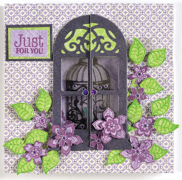 Die cut a window from Wildflowers dark purple paper. Back the top of the window with Wildflowers green paper, and cut down the center of the window. Use flip Flop Fasteners on the top and bottom to attach to the card front.