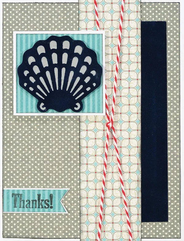 From the inside of the card front, wrap a length of Hop Scotch red/white baker’s twine around the tile border and twist ends on the center front. Wrap ends to the inside of the card and tie a bow. Ink edges of 2 ¼”x2 1/8” aqua stripe Robin’s Red paper and mat with white cardstock, leaving 1/8” border. Die cut the small shell from Navy Suede paper and back with Hammered Silver paper. Foam tape to the aqua strip rectangle and foam tape to the card, 7/8” from the top and 3/8” from the fold.
