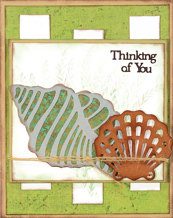 Die cut a silver hammered large seashell, and a brown leather small seashell. Ink the edges of both with Dark Brown ink. Back the large shell with Trail Blazer green/brown paper. Cut close to the Seashell edge. Glue and foam tape the shells over the stamped ferns. Wrap a twine twice around the cardstock, and foam tape to the card front. Place the Dazzles™ as shown.
