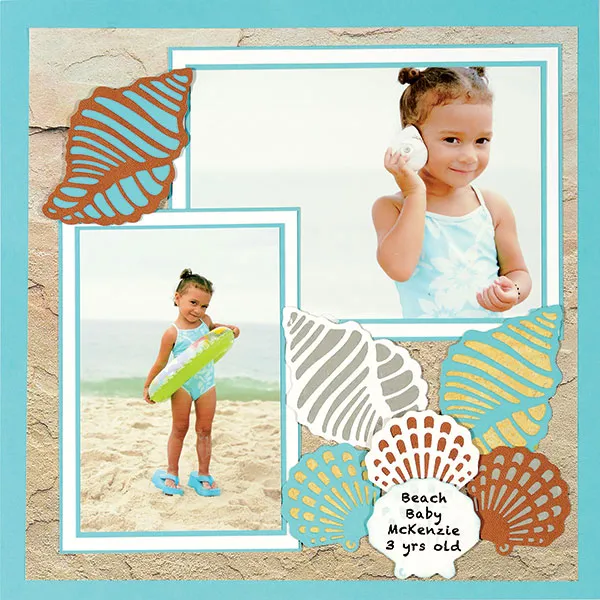 Die cut a large seashell from brown leather, white cardstock, and turquoise cardstock. Back each as shown. Cut close to the shells edge. Foam tape the brown leather shell on the top left corner. Glue the remaining two below the large photo as shown.