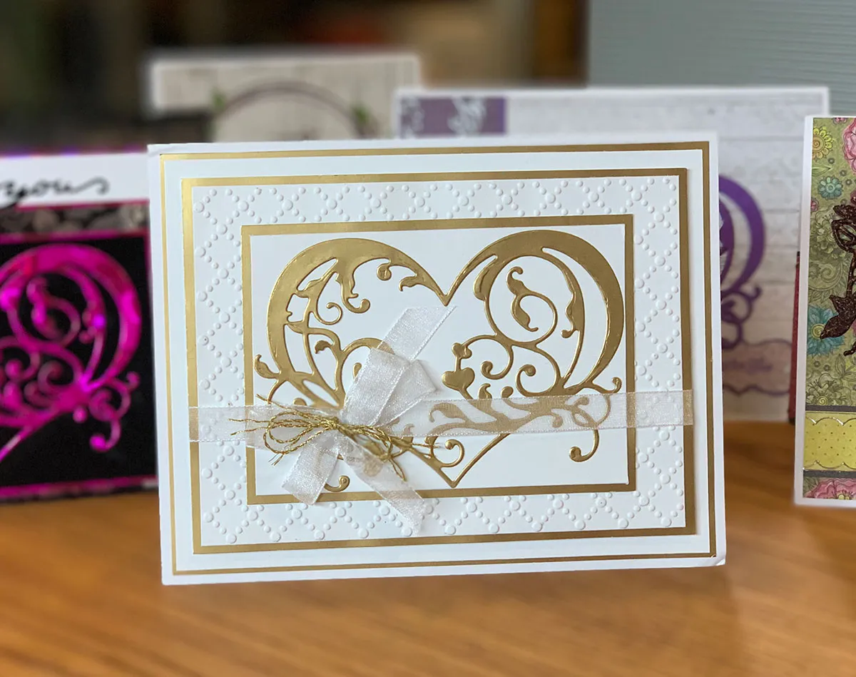 Place a 4½"x6" cardstock in the embossing folder and emboss it with the die cutting machine. Trim it to 4"x5½", then mat it on Gold paper with 1/8" borders. Die cut the heart from Gold paper and glue it to 4¼"x3" cardstock. Glue the heart rectangle to the center of the embossed panel.