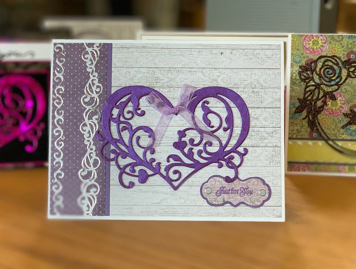 Cut three 4½"x3¼" purple cardstocks, then attach the double-sided adhesive to one side of each. Die cut a heart from each cardstock piece, die cutting one with the adhesive on the front and the other two with the adhesive on the backs.