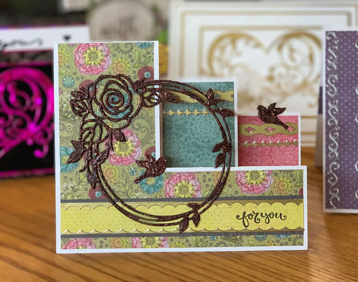 For the card front: Trace the paper patterns in the card packaging and cut them from Paper Painting papers: Cut the large front from small floral paper, the middle step from teal paper and the right step from pink paper.