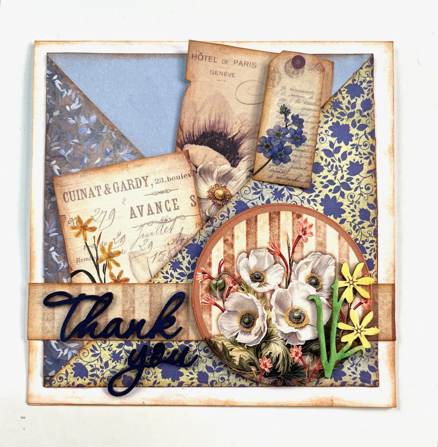 To make the pocket: cut 4 ½” squares of the papers then cut each diagonally making two right triangles. Overlap the triangles and glue to the card.