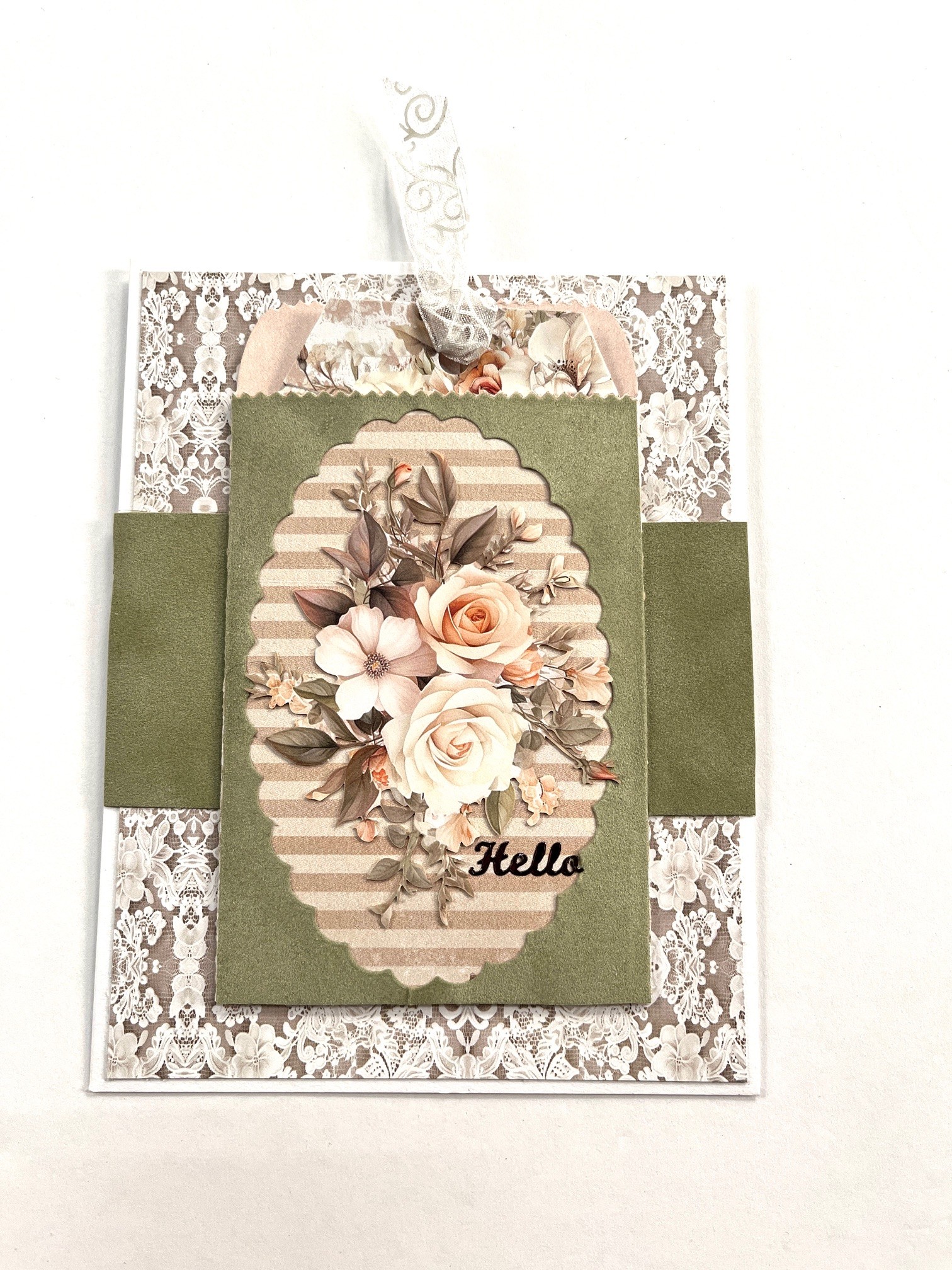 1. Cut 4 ¾”x6 ¼” lace One Perfect Day paper and glue to the card. Cut 5”x2¼” asparagus suede and glue across the center of the card.