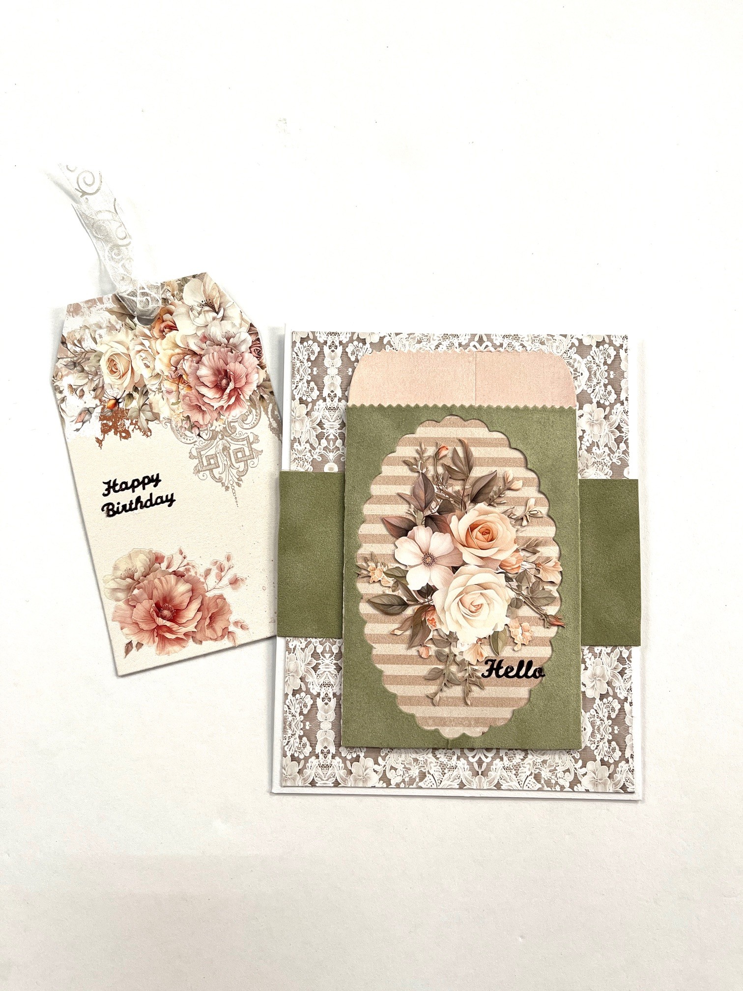 2. Use the Tag in a Bag dies instructions on the package to cut an envelope using the stripe One Perfect Day paper and the tag using the floral corner paper. Assemble the bag.