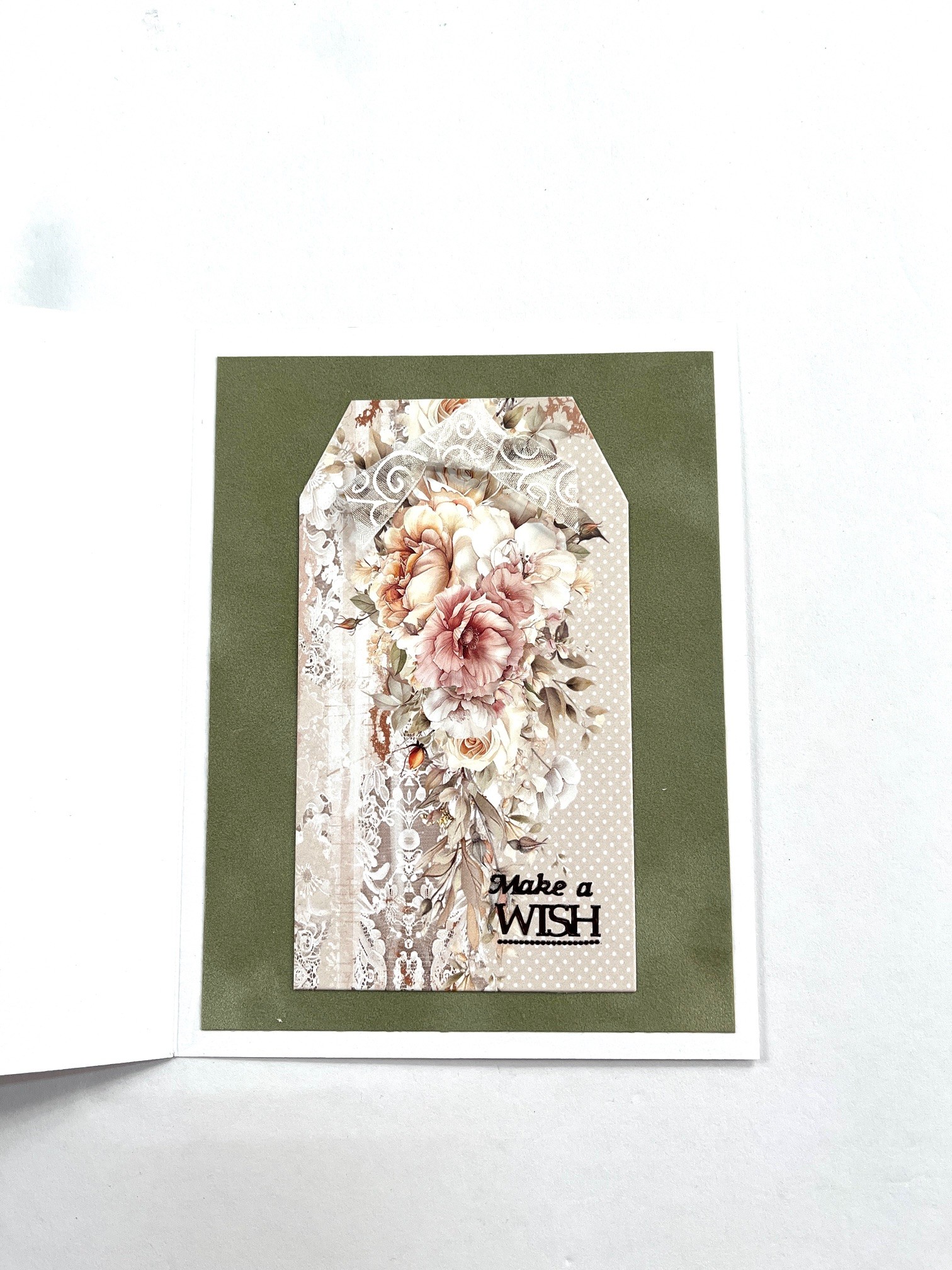 7. Inside: Glue 4 ½”x6” asparagus suede in the center. Die cut another tag from the paper shown. Tape to the center. Place “Make a Wish” and the border Dazzles™ as shown. Zot™ a knotted white ribbon at the top.