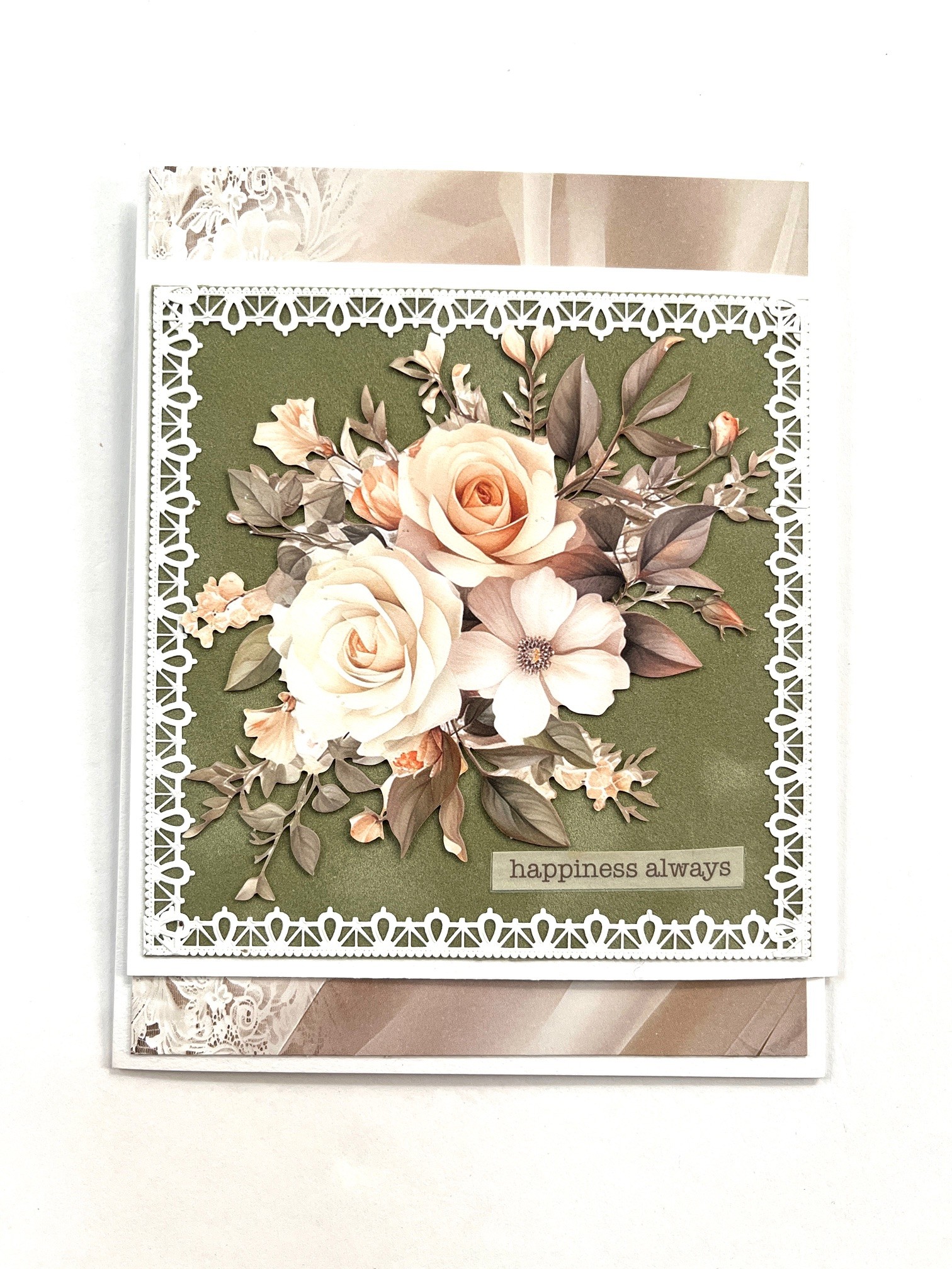 3. Place white Fancy Border Dazzles™ along the suede. Cut out the “happiness always” rub-on removing the tag on top. Remove the liner and position on the card. Use a bone folder to press on the rub-on. Carefully lift the film making sure the rub-on has been transferred. If it hasn’t, reposition and rub again.
