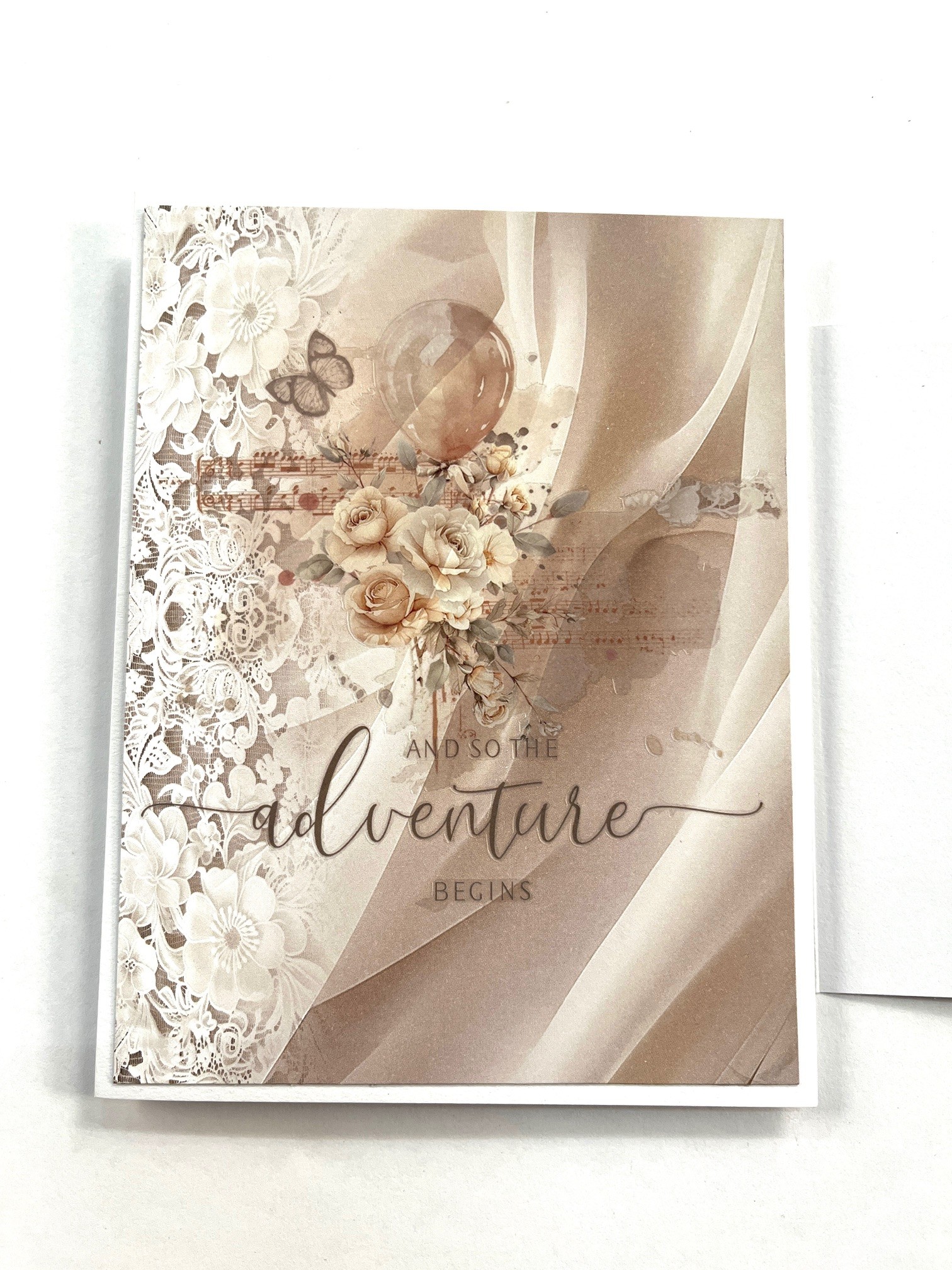 4. Open the flap and cut 4 ¾”x6 ¼” lace/satin paper then glue it in place. Cut around the balloon/floral rub-on. Remove the liner and position on the card. Use a bone folder to press on the rub-on. Carefully lift the film making sure the rub-on has been transferred. If it hasn’t, reposition and rub again. Repeat for the “and so the adventure begins.”