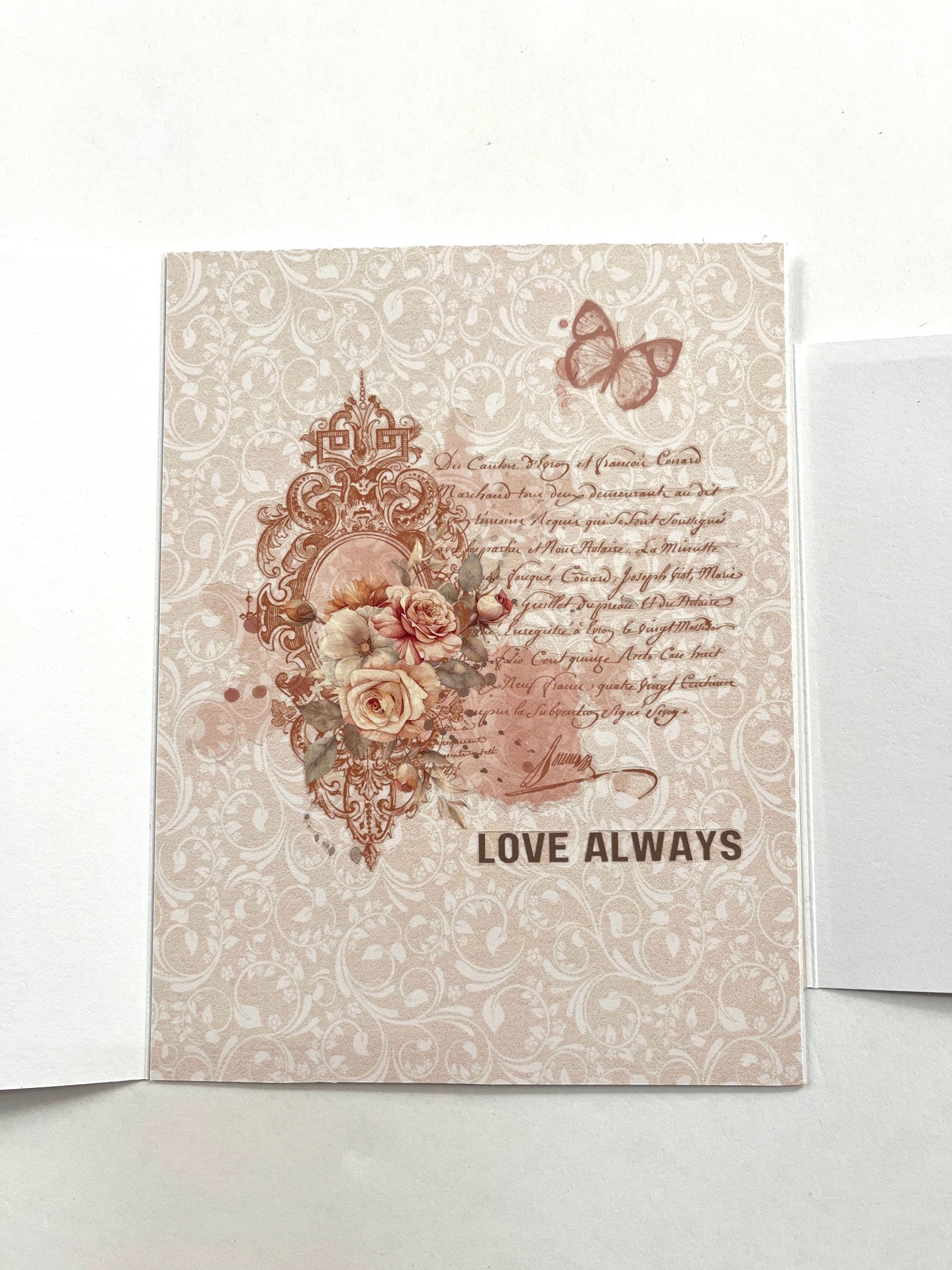 5. Inside: cover the inside with tan patterned paper. Cut around the rub-on shown. Repeat to attach it to the card. Repeat again for the pink butterfly and “love always” rub-ons.
