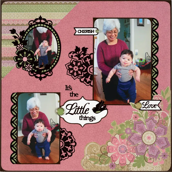 For the journaling: Place “cherish” and its matching banner frame onto white cardstock, and cut out. Insert a green pearl Embellies™ brad as shown. Glue to the page overlapping the top left of the large photo. Place “Love” and its matching banner frame onto white cardstock and cut out. Insert a tan polka dot Embellies™ brad and glue to the page overlapping the bottom right corner of the large photo. For the title: Use the “curved label” cutting die to cut the label from white cardstock. Mat on brown cardstock with a 1/16” border. Place “Little Things” Dazzles™ in the center. Insert a green Embellies™ brad and glue the label to the page 3” from the bottom and 4 ½” from the right. Place “It’s the” Dazzles™ above the label as shown.