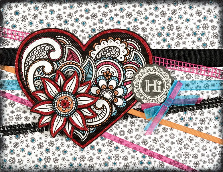 Foam tape the layers of the heart image from the Rhapsody Papier Tole. Glue to the front of the card ¾” from the top and ½” from the left side. Die cut a scalloped circle from black patterned paper. Stamp with VersaMark&trade,; sprinkle with White Embossing Powder and heat set to emboss a decorative circle frame onto the center of the circle. Stamp and emboss “Hi” in the center. Foam tape to the card as shown.